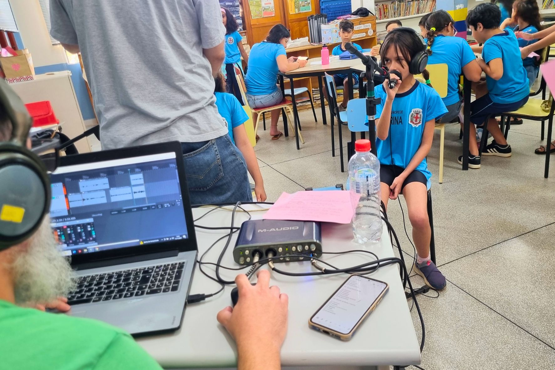 No laboratório de produção, cerca de 30 alunos do quarto ano tiveram a chance de aprender de forma prática através de um divertido jogo de cartas que simula a criação de uma rádio. Os temas de cada podcast foram escolhidos pelos próprios alunos, que estavam muito empolgados com a atividade. Entre locução, entrevistas, vinhetas e jingles, eles aprenderam a mágica do planejamento, gravação e veiculação de projetos radiofônicos. Foi uma aventura sonora e tanto.