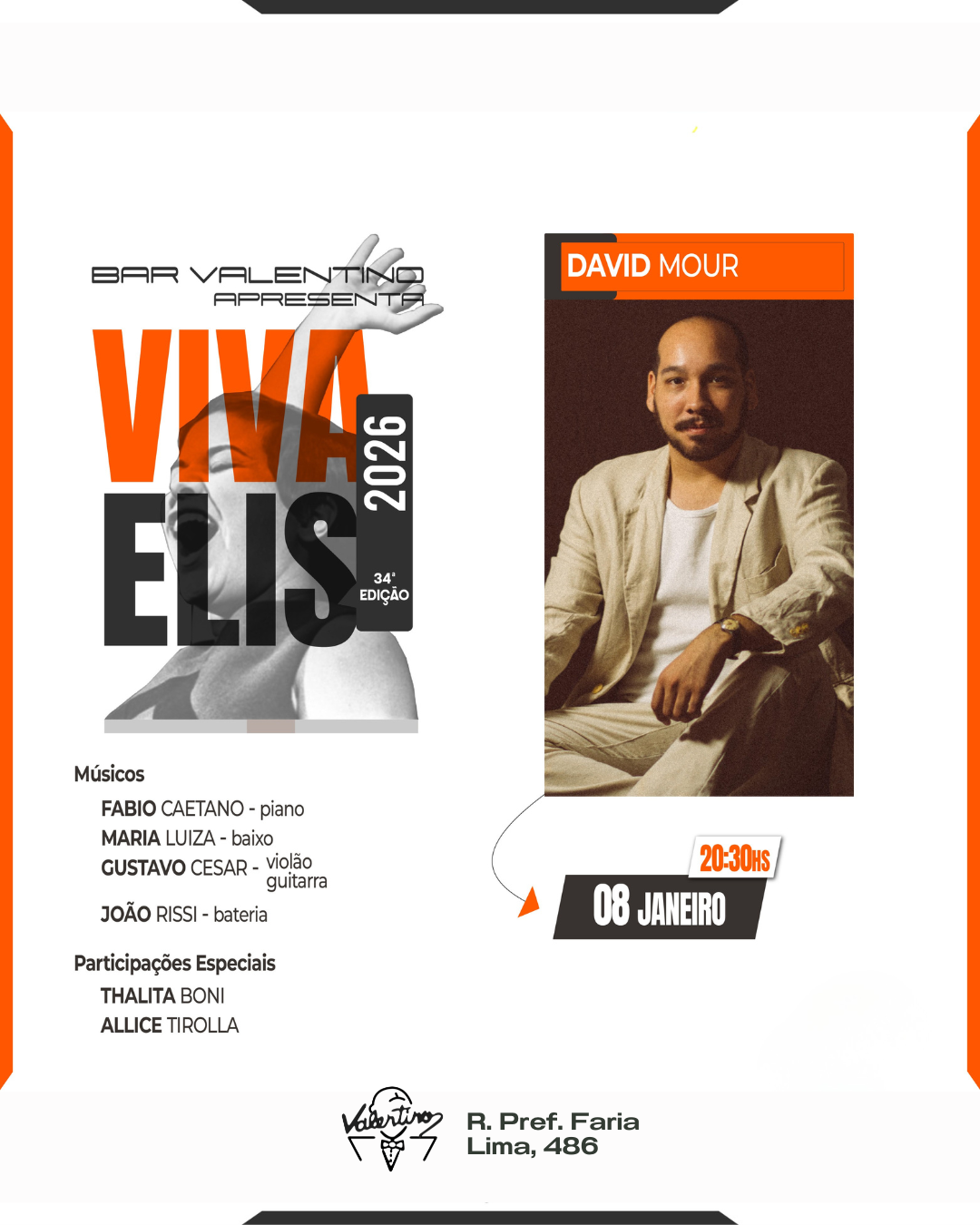 Serviço Bar Valentino apresenta “Viva Elis 2026” Show com David Mour e Banda Dia: 08/01, quinta-feira Abertura da casa: 19h30 Show a partir das 20h30: Ingressos: R$ 30 (+ taxas, antecipado na plataforma Sympla) / R$ 35 na portaria.